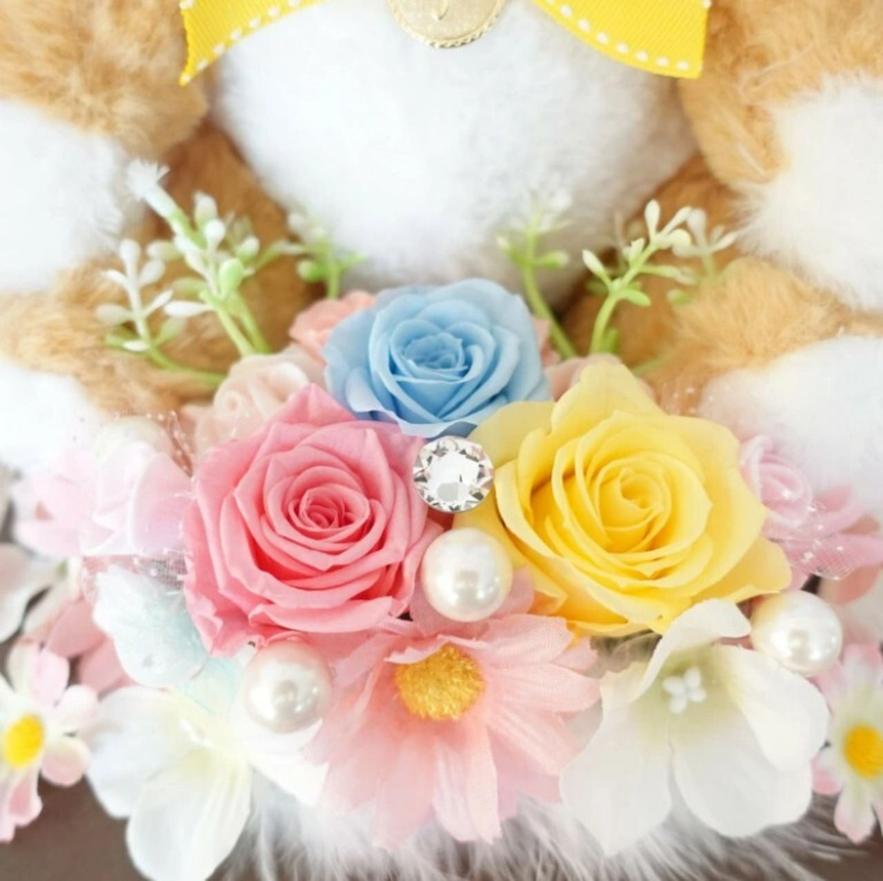 取り外しができますので、お花だけ飾って、ふわっふわのぬいぐるみの触り心地でとても癒されます。