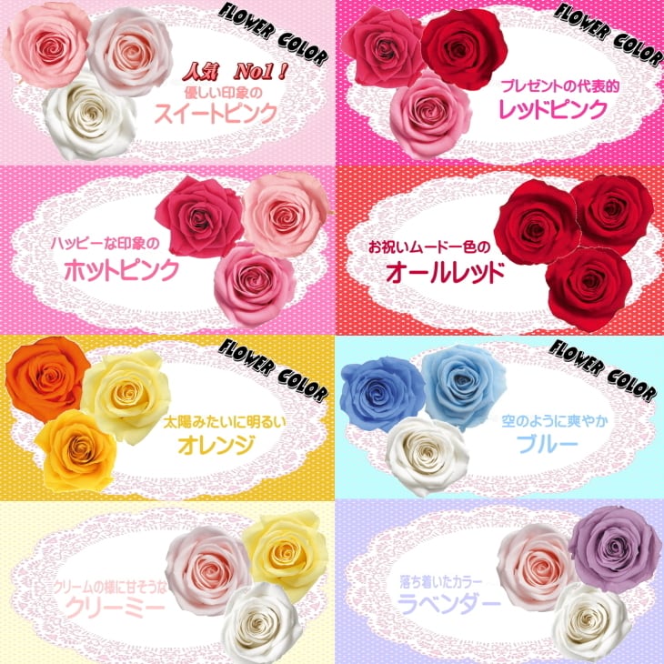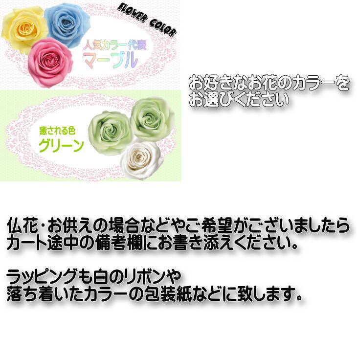 プリザーブドフラワーは生花に特殊加工し、高温多湿、直射日光を避けた状態で長年お楽しみいただけるお花です。